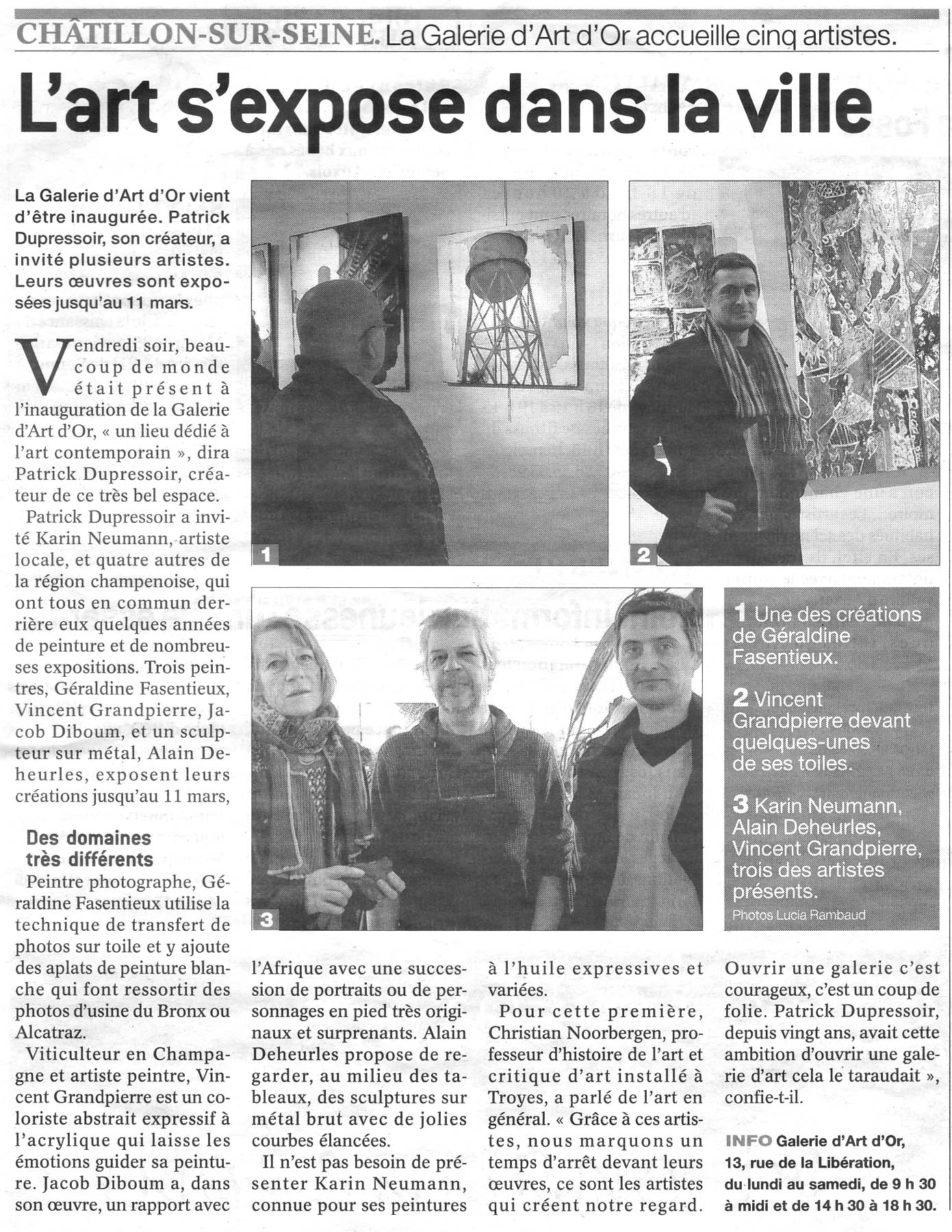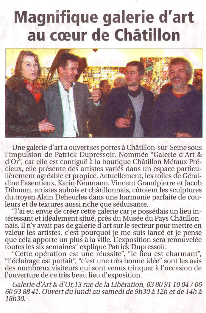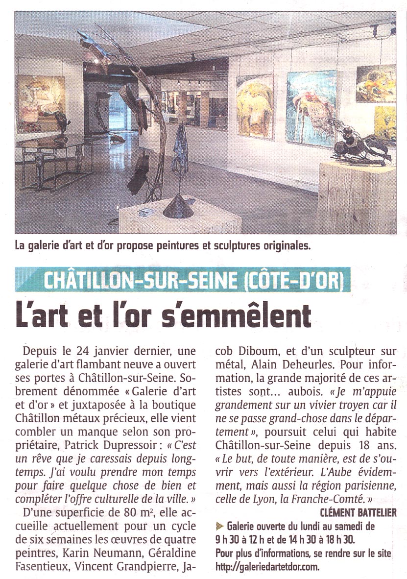 Vendredi 24 janvier 2014, une centaine de personnes se sont données rendez-vous pour l’inauguration de ce nouveau lieu dédié à l’art contemporain : La Galerie d’Art et d’Or de Châtillon sur Seine. Quatre peintres, Karin Neumann, Géraldine Fasentieux, Vincent Grandpierre, Jacob Diboum, et un sculpteur sur métal, Alain Deheurles y exposent leurs créations jusqu’au 12 mars.