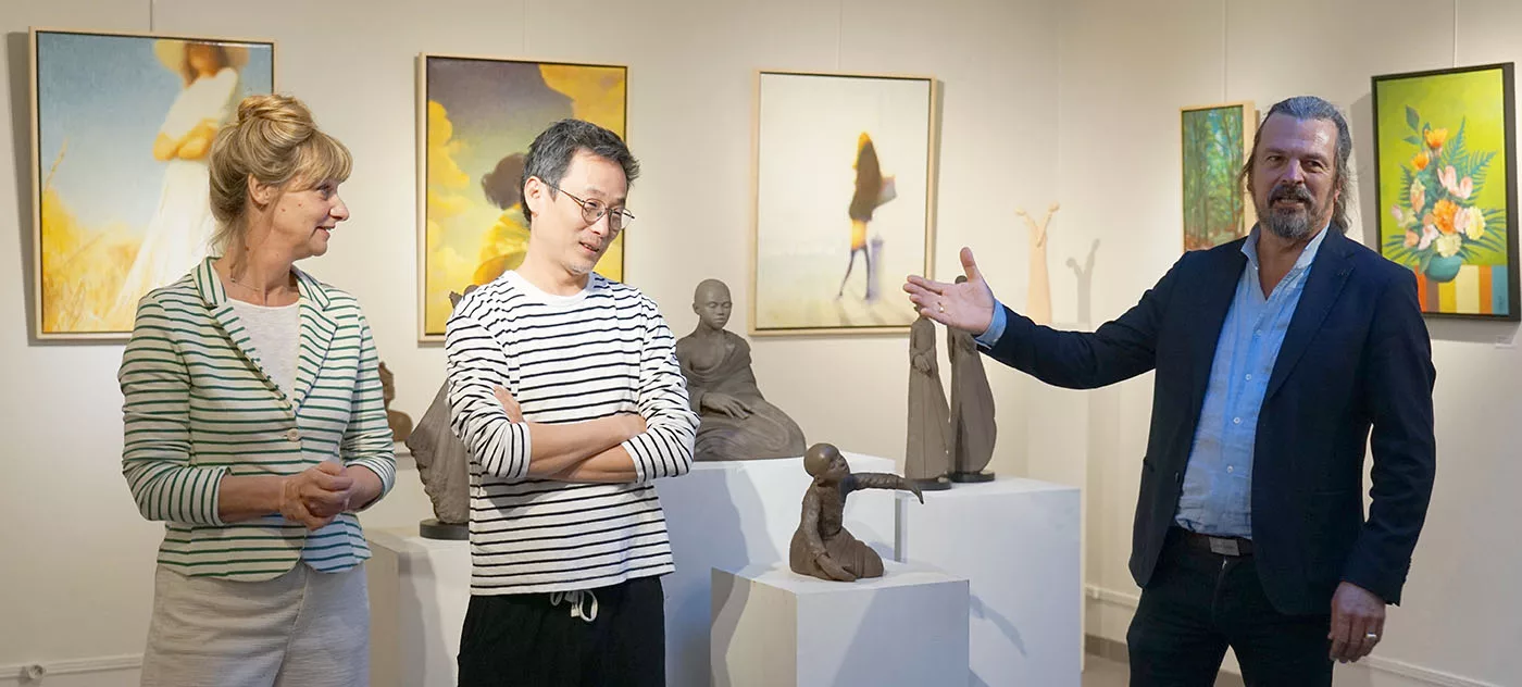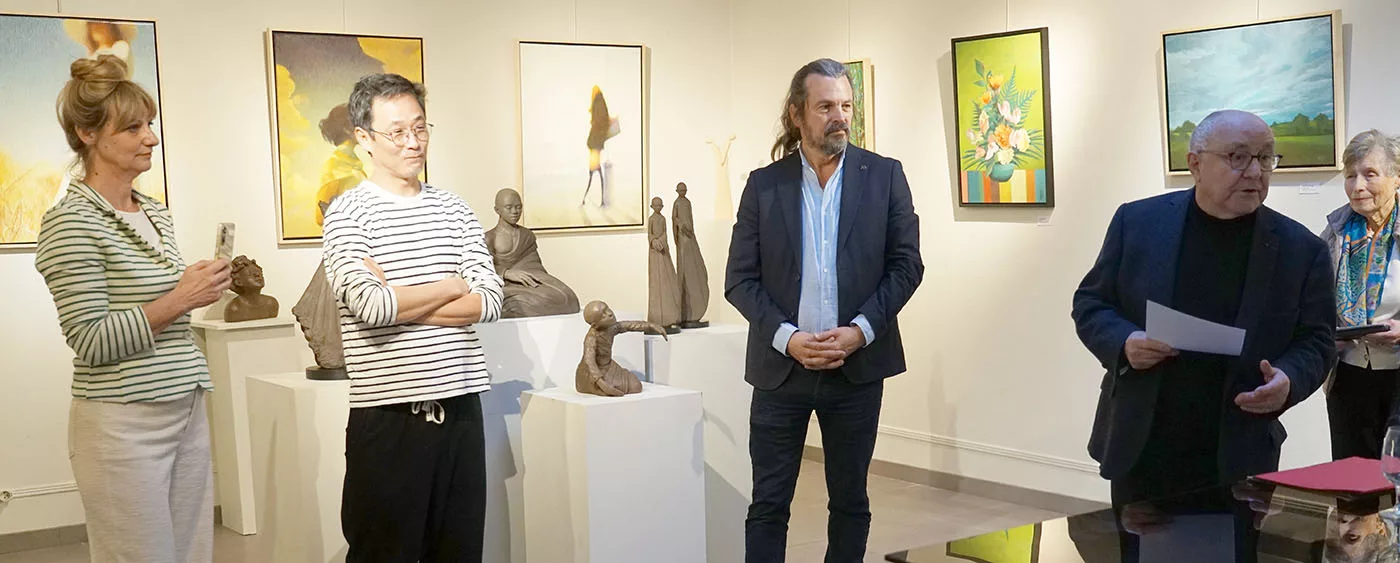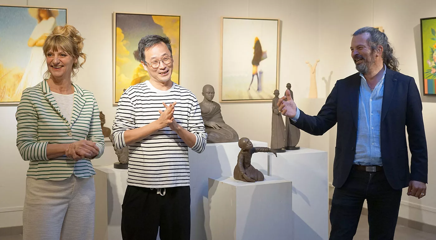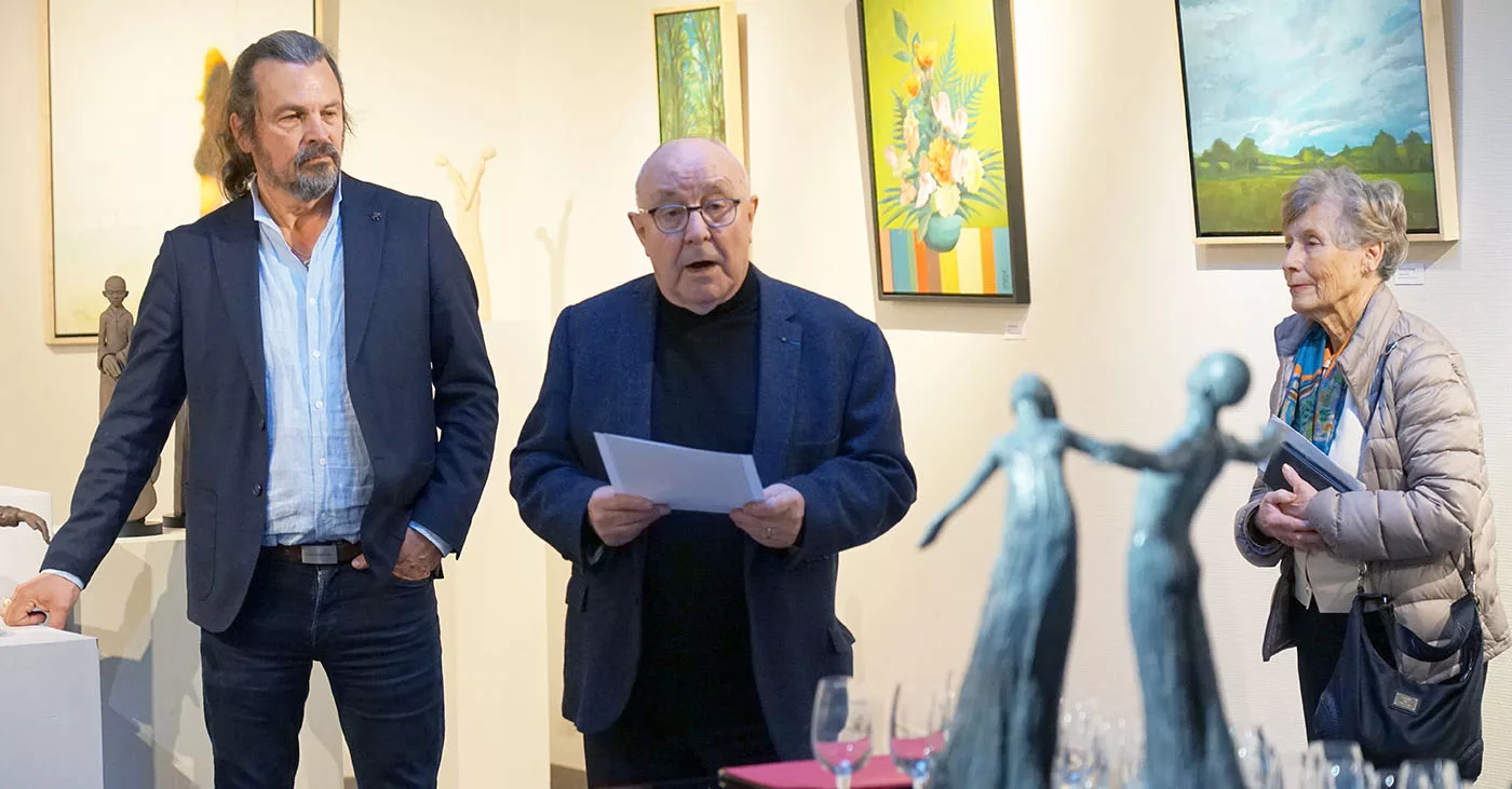 C’est donc un art de la simplicité acquise, du dépassement, de l’amour vital, de la confiance, et cela fait du bien. Et cela nous remet dans le secret de la beauté qui sauve, qui éclaire, qui transcende. Loin d’une création à la mode, d’un art brut, conceptuel, expressionniste, miroir de nos conflits. Ce n’est pas d’un miroir impuissant qu’il s’agit mais d’une fenêtre grande ouverte vers l’au-delà, où s’épanouit notre bonheur humain. Un art du salut spirituel et du dépassement de soi. Un art de l’exaltation qui grandit ceux et celles qui en sont habités. L’élongation des corps n’a rien de dramatique, comme chez Giacometti, elle est une invitation au bonheur d’aller plus haut que soi, dans une libération heureuse, dans une fusion sentimentale avec un idéal mis en beauté majeure.