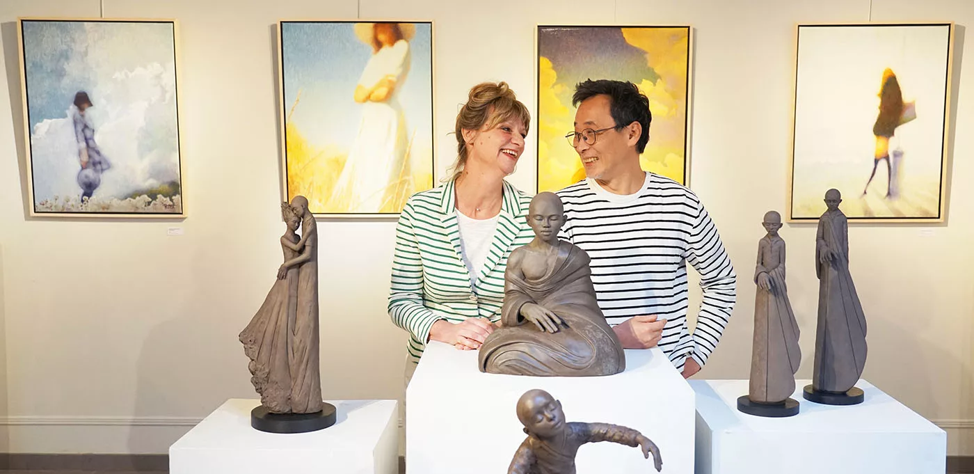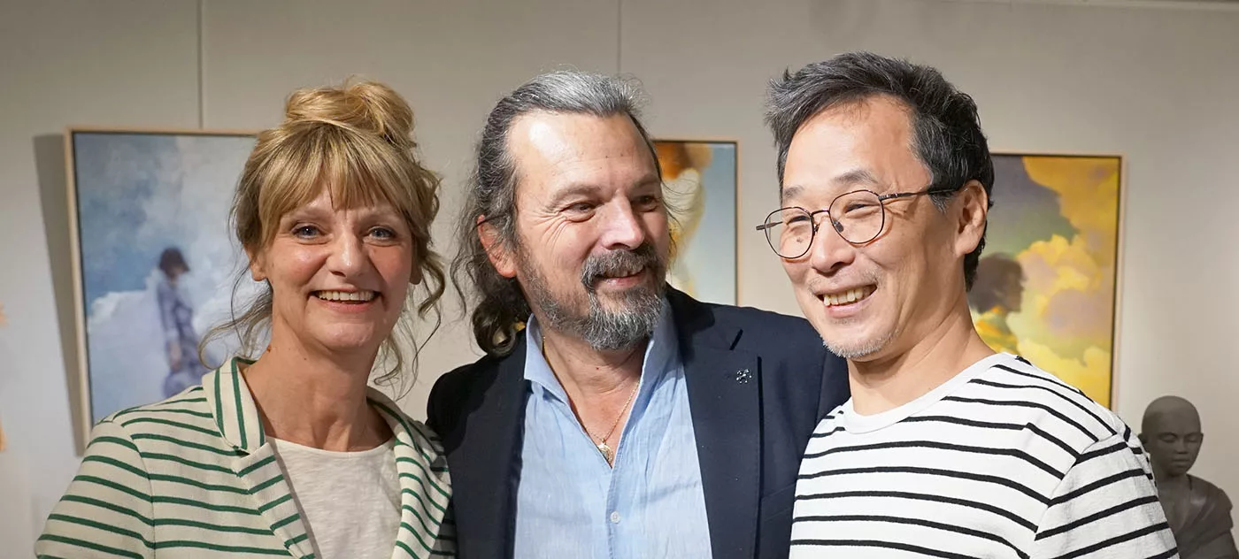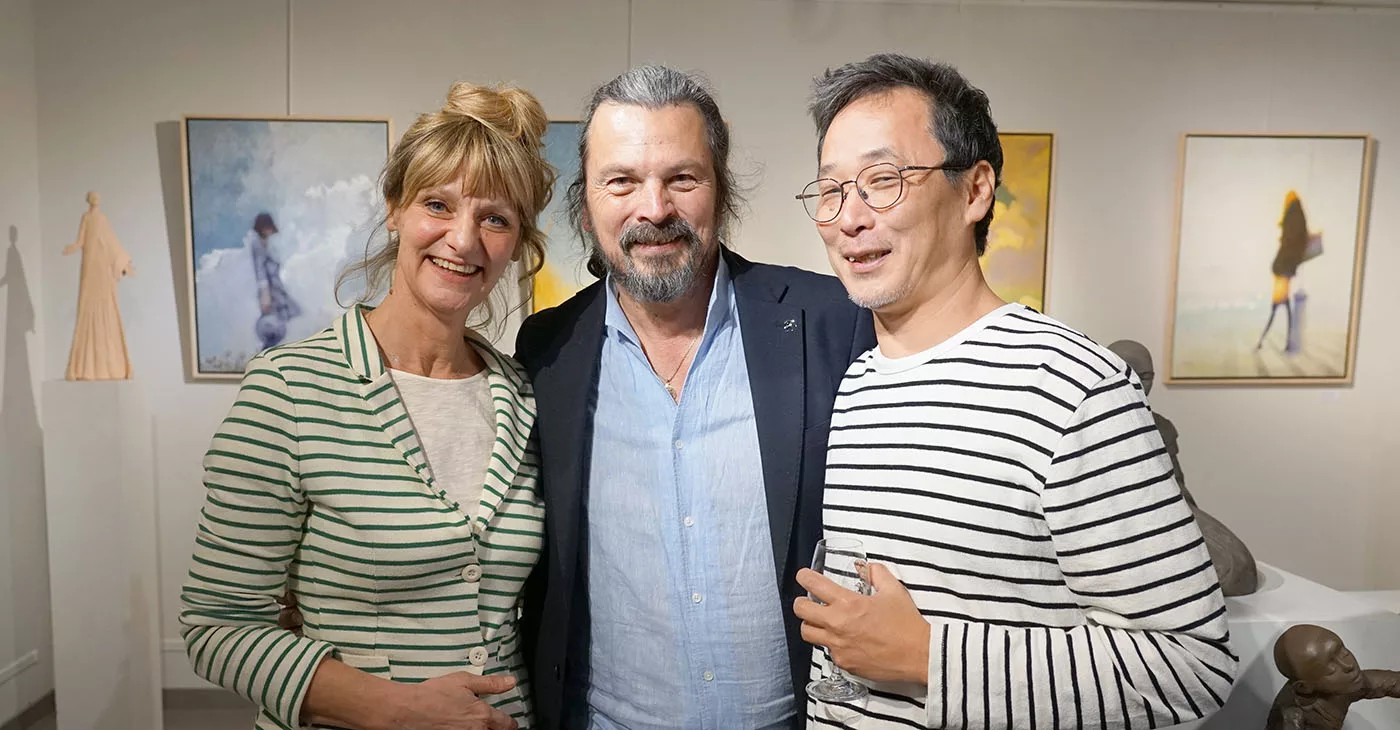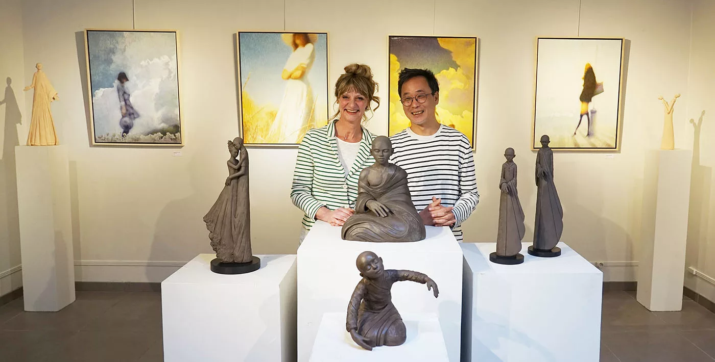 C’est donc un art de la simplicité acquise, du dépassement, de l’amour vital, de la confiance, et cela fait du bien. Et cela nous remet dans le secret de la beauté qui sauve, qui éclaire, qui transcende. Loin d’une création à la mode, d’un art brut, conceptuel, expressionniste, miroir de nos conflits. Ce n’est pas d’un miroir impuissant qu’il s’agit mais d’une fenêtre grande ouverte vers l’au-delà, où s’épanouit notre bonheur humain. Un art du salut spirituel et du dépassement de soi. Un art de l’exaltation qui grandit ceux et celles qui en sont habités. L’élongation des corps n’a rien de dramatique, comme chez Giacometti, elle est une invitation au bonheur d’aller plus haut que soi, dans une libération heureuse, dans une fusion sentimentale avec un idéal mis en beauté majeure.